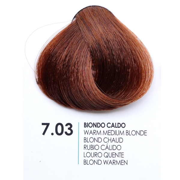 Цветови образец на боя за коса Fanola 7.03 - топъл среден блондин, наситен и здрав цвят.