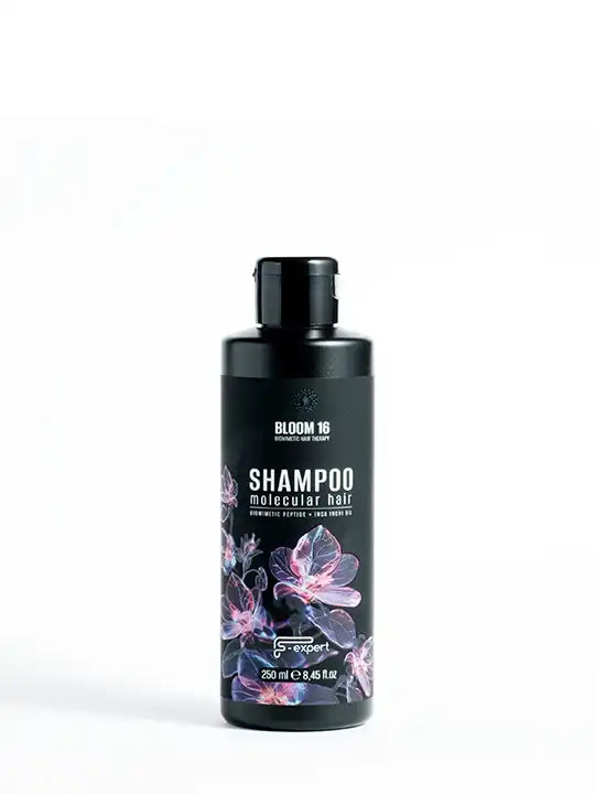 BLOOM 16 Molecular Hair Shampoo е иновативен безсулфатен шампоан, създаден по биомиметична технология за целенасочена регенерация на косъма и грижа за скалпа. Формулата му е обогатена с пребиотици, фитокератин, пептиди и органично масло от Инка Инчи, които възстановяват структурата на косата в дълбочина. Изключително икономичен и нежен, шампоанът съчетава наука и природа за видимо по-здрава, еластична и сияйна коса.