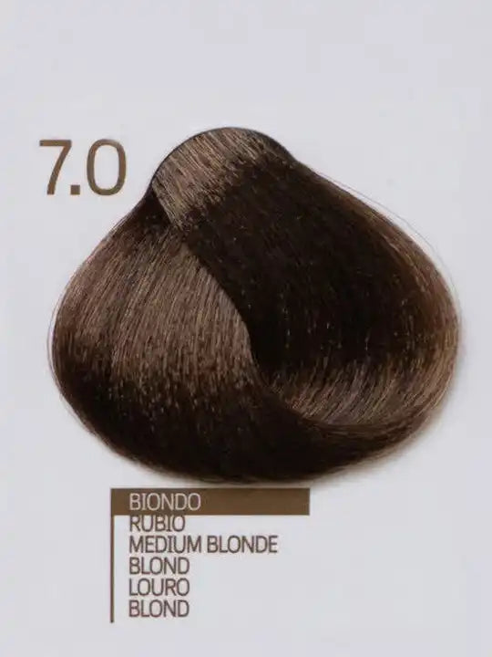 Design Look 7.0 Medium Blonde hair color sample showing rich tones for professional use.