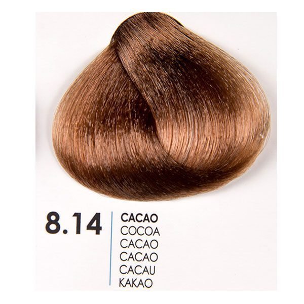 Цветова проба 8.14 Какао от боя за коса Fanola, показваща наситен и блестящ шоколадов цвят.