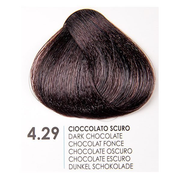 Fanola Chocolate 4.29 hair dye swatch in dark chocolate shade, showcasing rich color and shine.