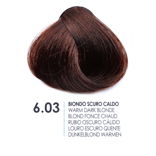 Цвят 6.03 - Топъл тъмен блондин, представен с кичур коса за боя Fanola.