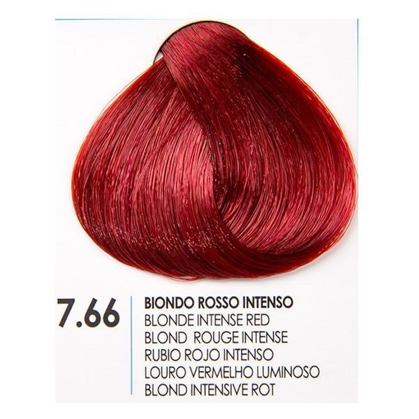 Примерна коса в интензивен червен цвят 7.66 от Fanola с описание на нюанса и богатството на цвета.