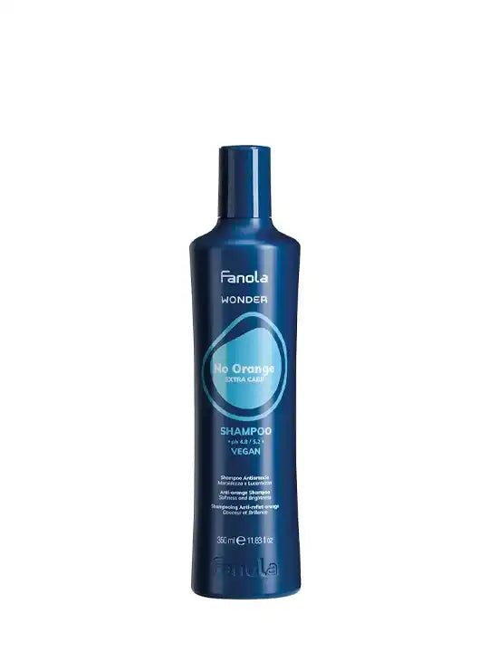 Fanola WONDER No Orange е професионален шампоан, създаден да неутрализира нежеланите медни и оранжеви тонове в боядисана или естествена тъмна коса. Благодарение на високата концентрация на сини пигменти, той ефективно премахва топлите оттенъци, придавайки на косата хладен и сияен вид.