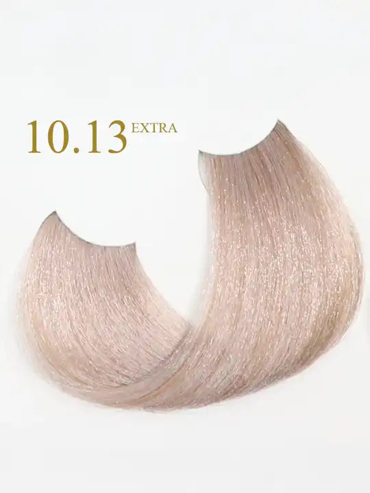 10.13 Blonde Platinum Beige Extra hair color swatch from ORO Therapy, showcasing soft, shiny tones.