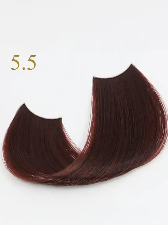 5.5 Light Chestnut Mahogany hair color sample from Oro Therapy, showcasing rich dark red tones.