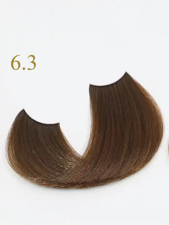 Цвят 6.3 Dark Blonde Golden на боя за коса Oro Therapy, представен в две тестови кичури.
