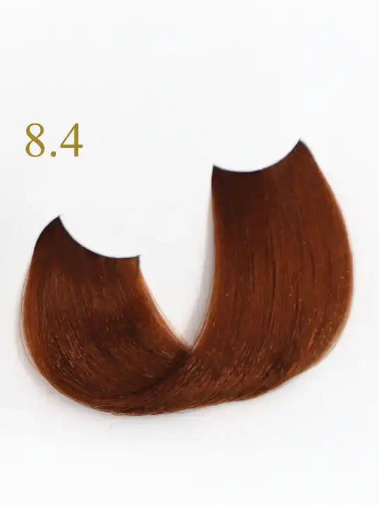 8.4 Light Blonde Copper hair color sample from Oro Therapy, showcasing rich warmth and shine.