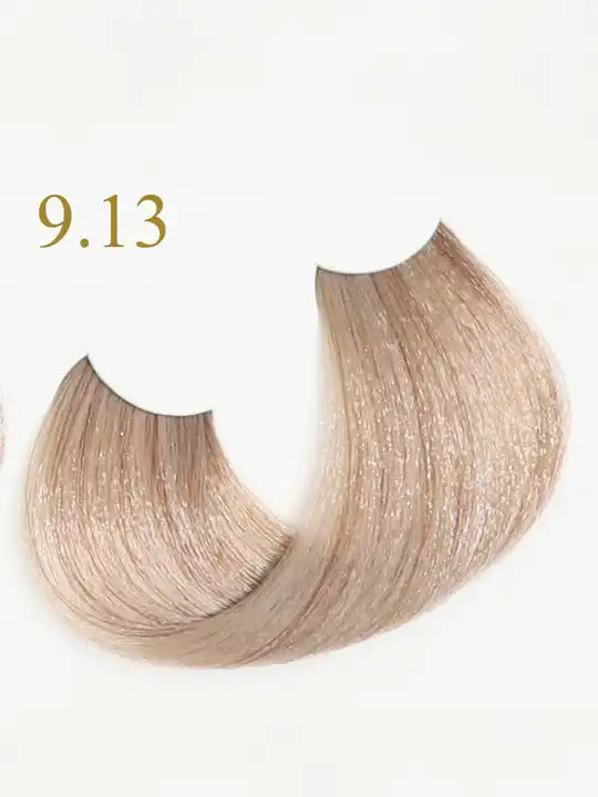 9.13 Very Light Blonde Beige hair color swatch from Oro Therapy, showcasing a soft, shiny texture.